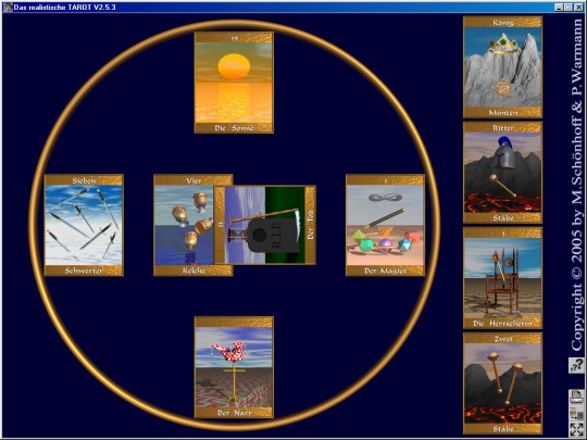 Das Programm legt und deutet Tarot-Karten. Es kennt drei Legesysteme: